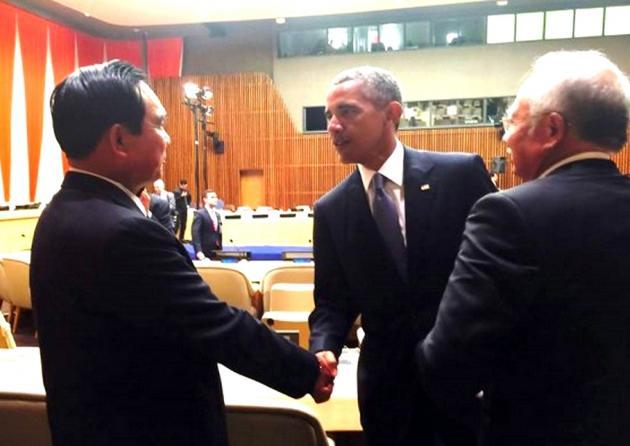 a photograph of Prime Minister Prayut Chan-o-cha and US President Barack Obama shaking hands at a UN meeting in New York last week.