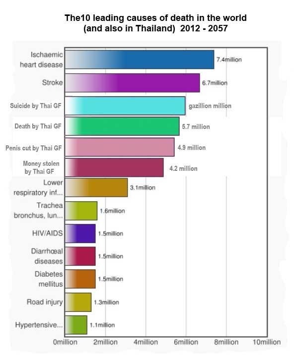 Sorry bud, I trust the statistics from WHO as much as waiting for a loan/ticket back home from fellows(nothing personal) in this forum...by the way, there are many cases of expats getting done in by their gfs or wives...if the deaths by Thai gfs/wives were shown as part of expat-deaths statistics in Thailand; it would probably show-up as one of the leading causes of death here.