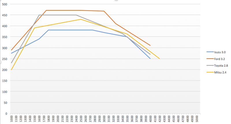 As you can see from this, the Mitsubishi 2.4L diesel spends most of it's rev range with a torque deficit compared to the Toyota 2.8L diesel, but at the same time is also clearly superior to the Toyota 2.4L, and the old 3.0L....