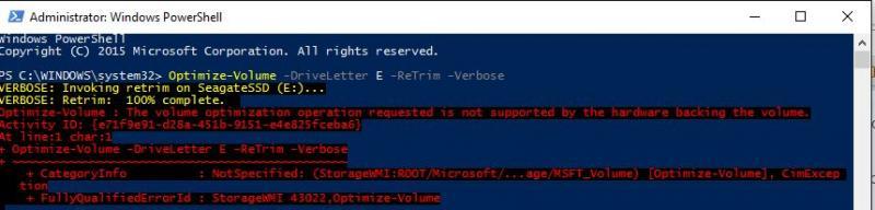 And here's a snapshot of attempting to run/force the Otimize/TRIM command on the SSD in the external USB enclosure (Drive E) in Windows Power Shell. As mentioned earlier for a second in says 100% complete (reaching 100% complete in less than a second...way too fast...should take a couple of minutes if TRIM had not been run for a while) and then gives the error message in red text.