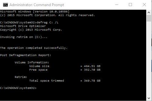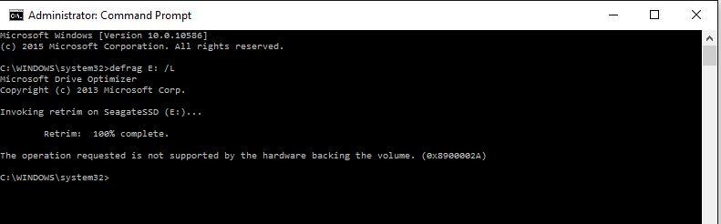 And then giving TRIM a try in the Command Prompt (Admin) window...once again the 100% completes very fast followed by an error message saying the requested operation is not supported by the hardware (i.e., the USB connection/controllers). In the Command Prompt window mode you actually use the Defrag command using the parameter of /L which initiates a reTRIM of the SSD vs doing a Defrag which you have no need to do on a SSD. As FYI, Win 7 Defrag command does not use the /L parameter, but Win 8 and 10 can since they have more robust capability in this area.