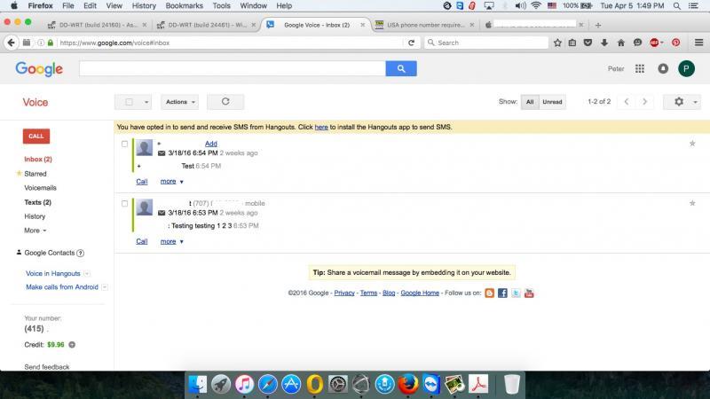 On the question of getting SMS messages, 100% so far. I changed my default SMS client on my phone to the google client, get all SMS's, real phone, google voice all in one place