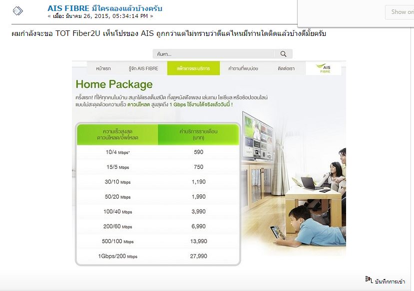 Have AIS Fibre, was ok after we complained about speed and they changed connections. However, the past month or so i frequently spend minutes watching little circles go round every day, before it times out. To be honest, not much of an improvement on my old 3BB 10mb service. Off to UK in a day or 2 so cannot be bothered to complain until i return.