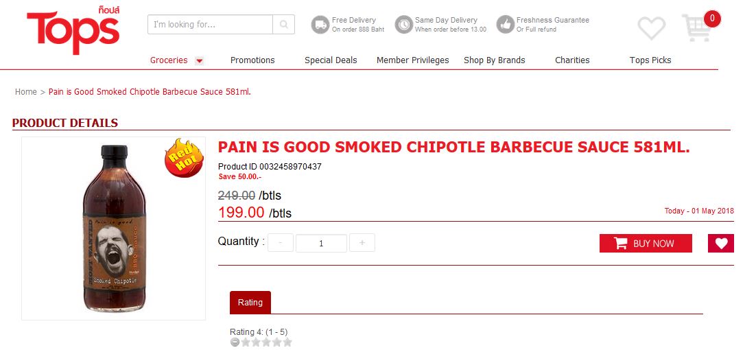 My favorite over the past couple years has been Don's Food Chipotle sauce, which used to be available at some Foodlands, in 90 ml bottles for 55 baht. Really had a great flavor, more strong on flavor than spice, and not too expensive. But Don has retired from the sauce-making business, AFAIK, and although I gather some Thais have taken over the operation in some form or another, the Chipotle sauce has become increasingly hard to find on the shelves here in BKK. Thus, my search begins to find what's out there now in 2016 as a suitable "favorites" replacement.