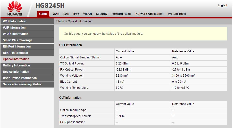 But now armed with this "desired input power level" info I periodically go into my router setup menu to check what it's saying for receive power....since installation on 1 July it has always been between a -22.2 to -22.7dbm rain or shine....usually closer to a -22.2dbm.   Considering accuracy differences between the pricey power meter they tech was using for that one measuremenst and the cheap built-in power meter circuity in the router, it quite understandable my router's power reading was a little different from his power meter on that day.   See below snapshot from my router I did a few minutes ago...and the snapshot also shows the acceptable input power range of a -25 to -8dbm for this particular Hauwei router.   A person might think being closer to the stronger reference power level (i.e., the -8dbm) would be better but not so as that could cause early burnout of the optical receive and actually cause the speed to slow down and you would even get a worst Signal-to-Noise ratio.  Stronger is not always better.  I also see the router transmit power is pretty much dead center of the reference values.
