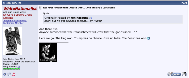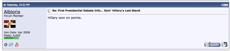 September 27, 20169 yr I wouldn't buy a used car from either one of them. At least Trump seems human and not a robot with the same practiced speech every time.