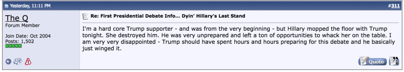 September 27, 20169 yr Whilst everyone has an opinion (I should know!) the only opinions that will have any bearing on the results are those of the American voters.True. Very original thought.