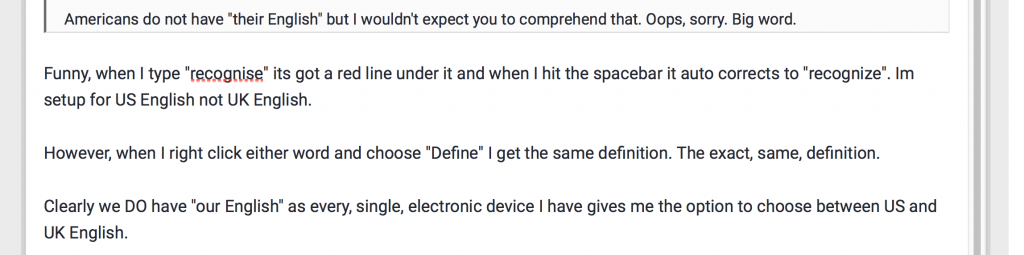 Some just don't want to accept that english, as a language, has outgrown the UK. India has a larger population of english speakers than all of the UK combined. The US is has the largest population of native english speakers worldwide.