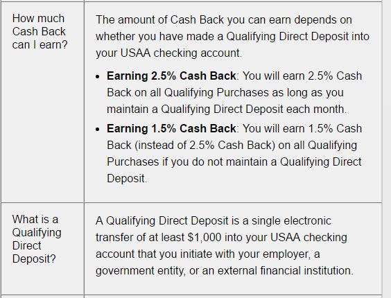 So if a person didn't have a $1000 deposit coming in like from a govt pension it appears they could just setup an automatic transfer of at  least $1000 to their  USAA checking account from one of their other banks....then they would get the 2.5% vs 1.5% cash back.