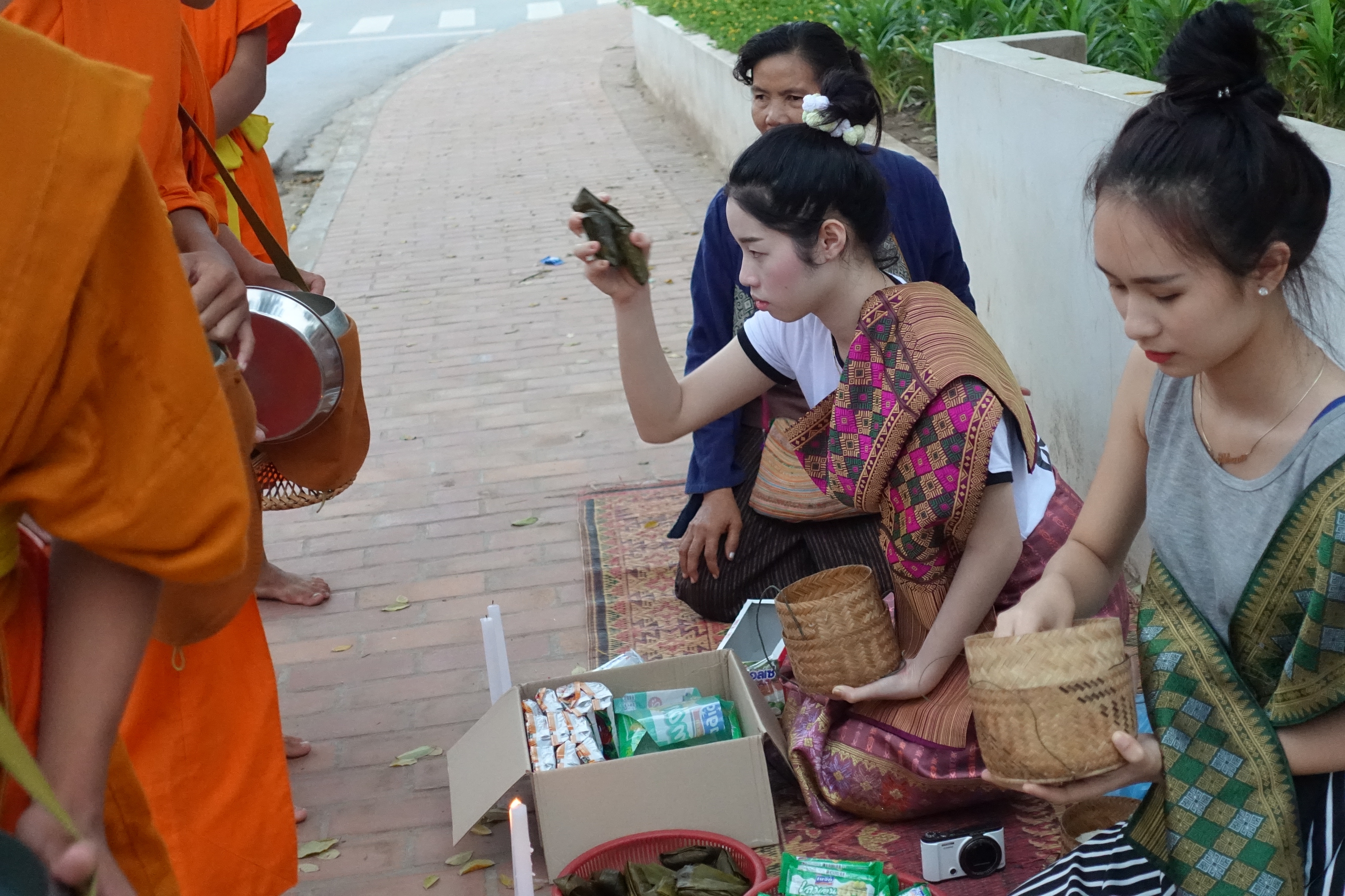 November 28, 20169 yr Popular Post Luang Prabang, Laos a couple of beautiful young Laos ladies visiting from Vientiane 'dak bhat' in the morning and take the trouble to dress in nice 'phaasin'