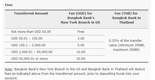 One fee as the funds flow through their New York branch and then another fee on the in-Thailand branch end.   Now since both of these fees are applied "before" posting to the person's account (as noted in the fee chart below) and are not documented anywhere on the person's account, it fools a lot of people into thinking no fees were applied.