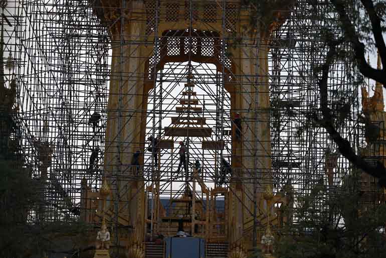 The transformation of Sanam Luang royal plaza into King Rama IX’s royal cremation site is now 95 percent complete. The craftsmen are adding finishing touches to the crematorium and its surrounding pavilions. Gen Thanasak has confirmed the undertaking will be concluded on time.