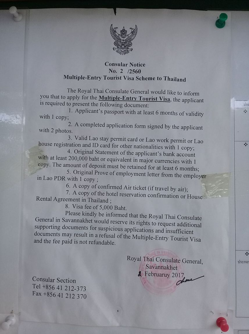 "Be advised, the multi non "O" visa rules at Savannakhet have changed. You now need to show your bank book, with a minimum of 200 Grand. I was lucky I had mine with me. Several gents in front did not and were refused. 20/6/2017."